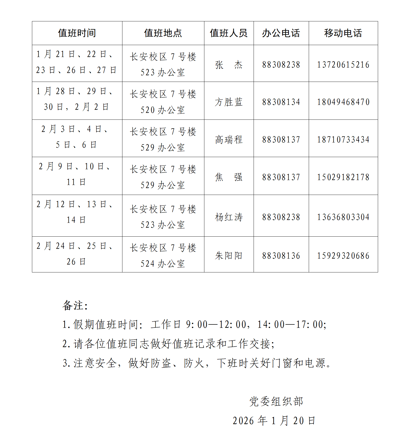 党委组织部寒假值班安排