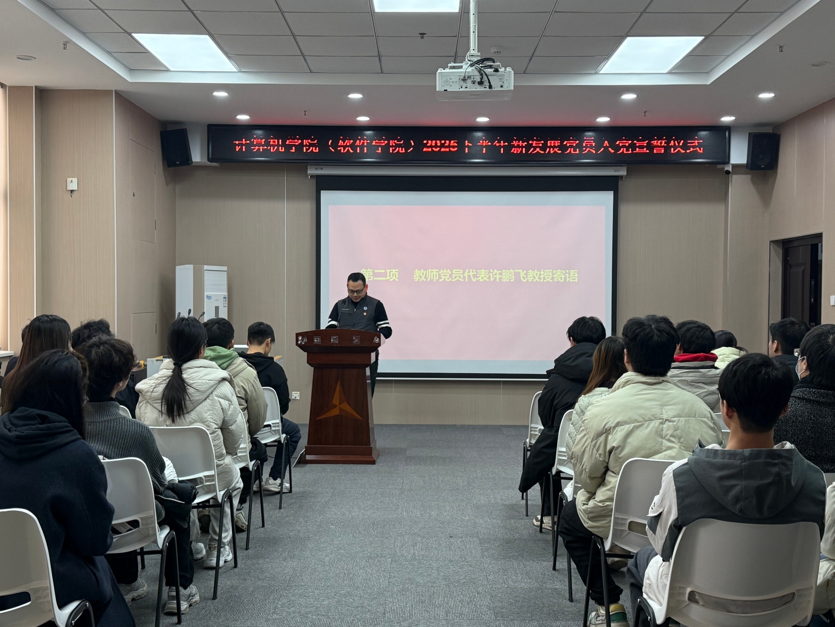 仪式在庄严的国歌声中拉开序幕。许鹏飞作为教师党员代表,向新党员们深情寄语。他勉励大家要始终坚定理想信念,牢记党员身份,在科研攻关、服务师生中勇挑重担,发挥先锋模范作用,将个人奋斗融入学院发展和国家信息强国建设的大局中。
