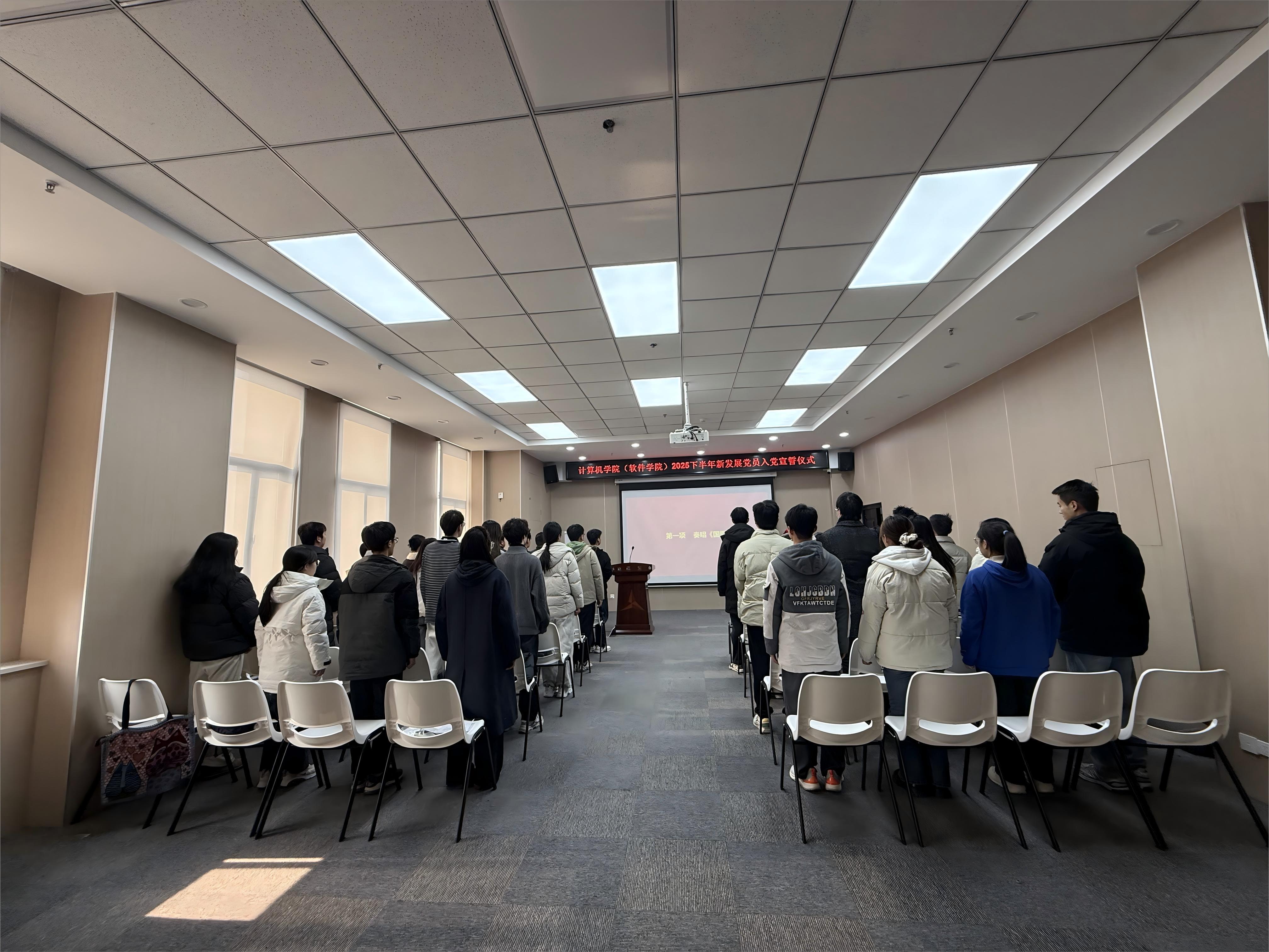 12月30日中午,计算机学院党委在院楼1006报告厅举行2025年下半年新发展党员入党宣誓仪式。学院党委副书记贾文涛、物联网科研团队第一党支部书记许鹏飞、学院党委组织员杨帆、党委分党校及学生支部委员代表出席仪式,与19名新发展的预备党员共同见证这一重要时刻。仪式由学院党委组织员杨帆主持。